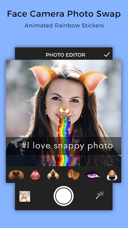 Make wonderful photos with Snappy Camera and get more likes and more followers by using Snappy Photo Filters & Stickers! Because the Stickers Emojis Filters you select are saved in the photo that you post they will be the same on Android for free Amazing snappy photo filters & stickers app for your face for free and creative cool smiley filters and stickers & emojis to your photo !! Add Emoji, filters & stickers to your pictures, we have added emoji - stickers , autocollants and filters have more fun pictures using this awesome emoticons.