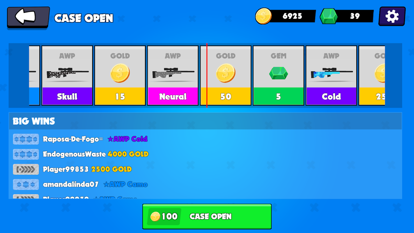 Apri il caso e guadagna premi GOLD, GEM e AWP. Hai solo bisogno di spendere 100 monete d'oro per aprire la custodia della pelle. Tenta la fortuna per vincere skin gratuite!