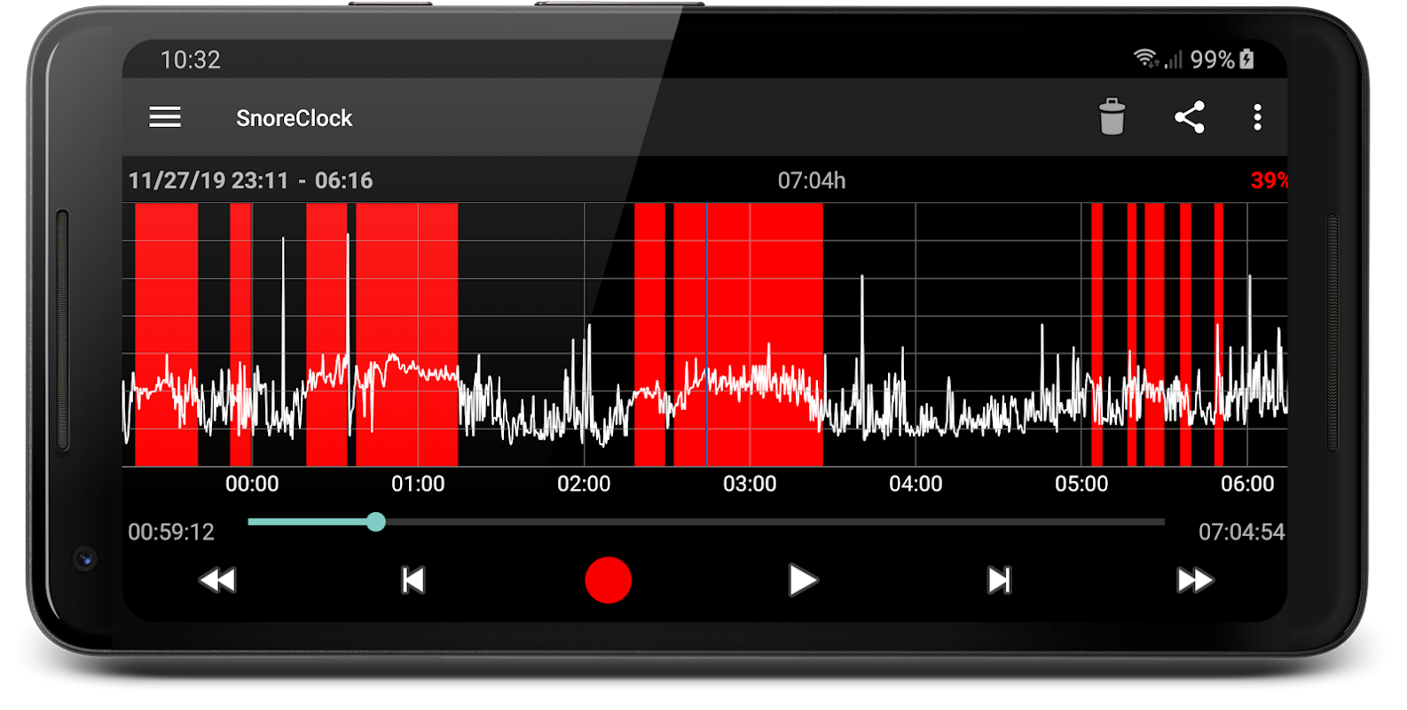 SnoreClock registra l'intera notte ed evidenzia i casi probabili di russamento con barre rosse.