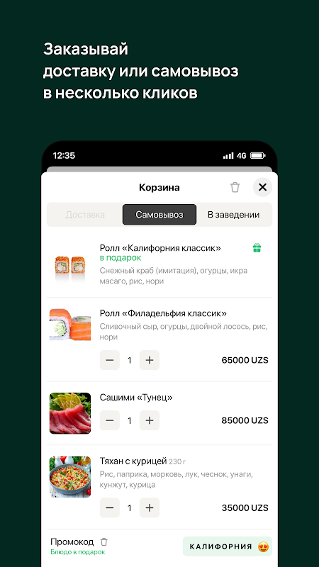 Nel nostro ristorante SOBRANIE a Tashkent puoi ordinare la consegna di sushi e panini freschi direttamente al tuo tavolo! Prepariamo su ordinazione: