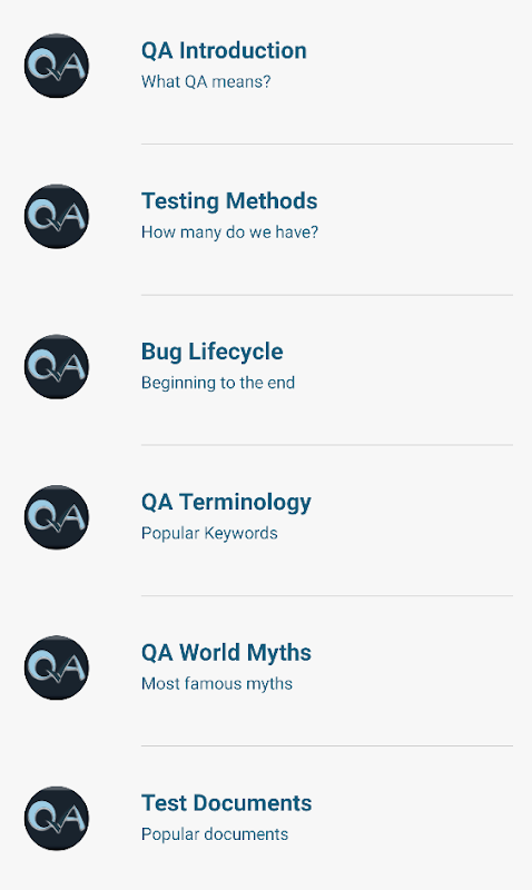 Il test del software (QA) è diventato recentemente uno dei lavori Hi-Tech più popolari. L'importanza del controllo di qualità all'interno di un'organizzazione è estremamente preziosa. Nella nostra applicazione puoi trovare le migliori pratiche per i principianti del test del software (QA): materiali per studenti, domande e risposte (domande e risposte) per interviste, quiz, tutorial video, feed di lavoro e molti altri. Vuoi dare il via alla tua carriera di QA Engineer? scarica la nostra app e divertiti. 100% gratuito e utile