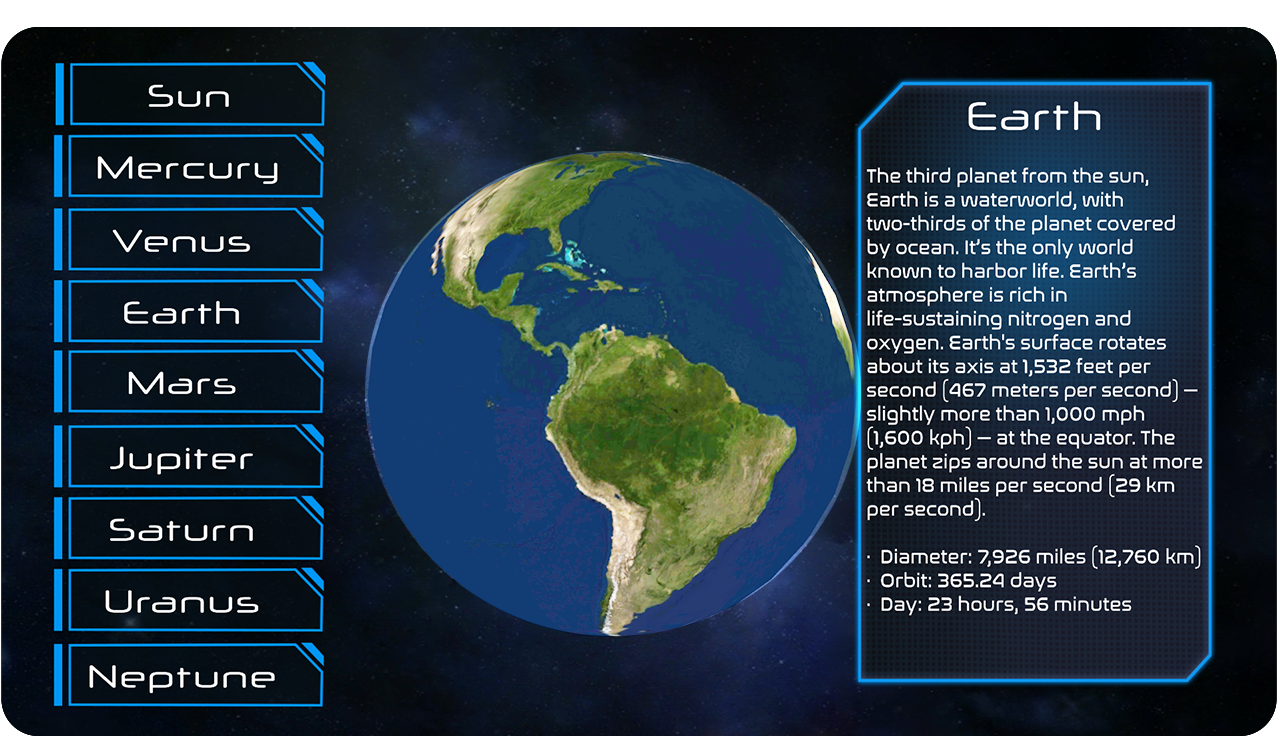 - Entire solar system with the Sun, 8 major planets.