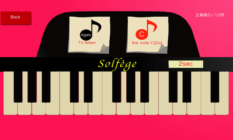 各コースとも12問です。音を聞いて、正しいと思う鍵盤を押します。間違ってもかまいません。12こ正解したら終了。12こ正解するのに何秒かかったのかによって、