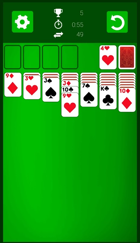 Solitaire Classic - a highly addictive Klondike card game for everyone! Solitaire Classic is the perfect card game for every fan of the retro mobile game classic and one of the best known and most fun single-player card games of all times. Solitaire is as simple as it is addicting. The goal is simple: you have to move all existing cards onto the four foundation piles. Achieving that is not that simple, however. You have to attach all cards to the piles on the bottom, in a descending order and with alternating colors. Uncover cards from the pile on the upper right, if necessary. You can also adjust the difficulty by choosing to always uncover three cards at once instead of one. On the upper left you have to first place the Aces (which count as 1) of each color. These are the basis of the foundation piles. Here you have to pile up all cards starting with the Aces, but this time in ascending order and of the same color, Ace to King. If all four foundation piles are complete, you have beaten the game