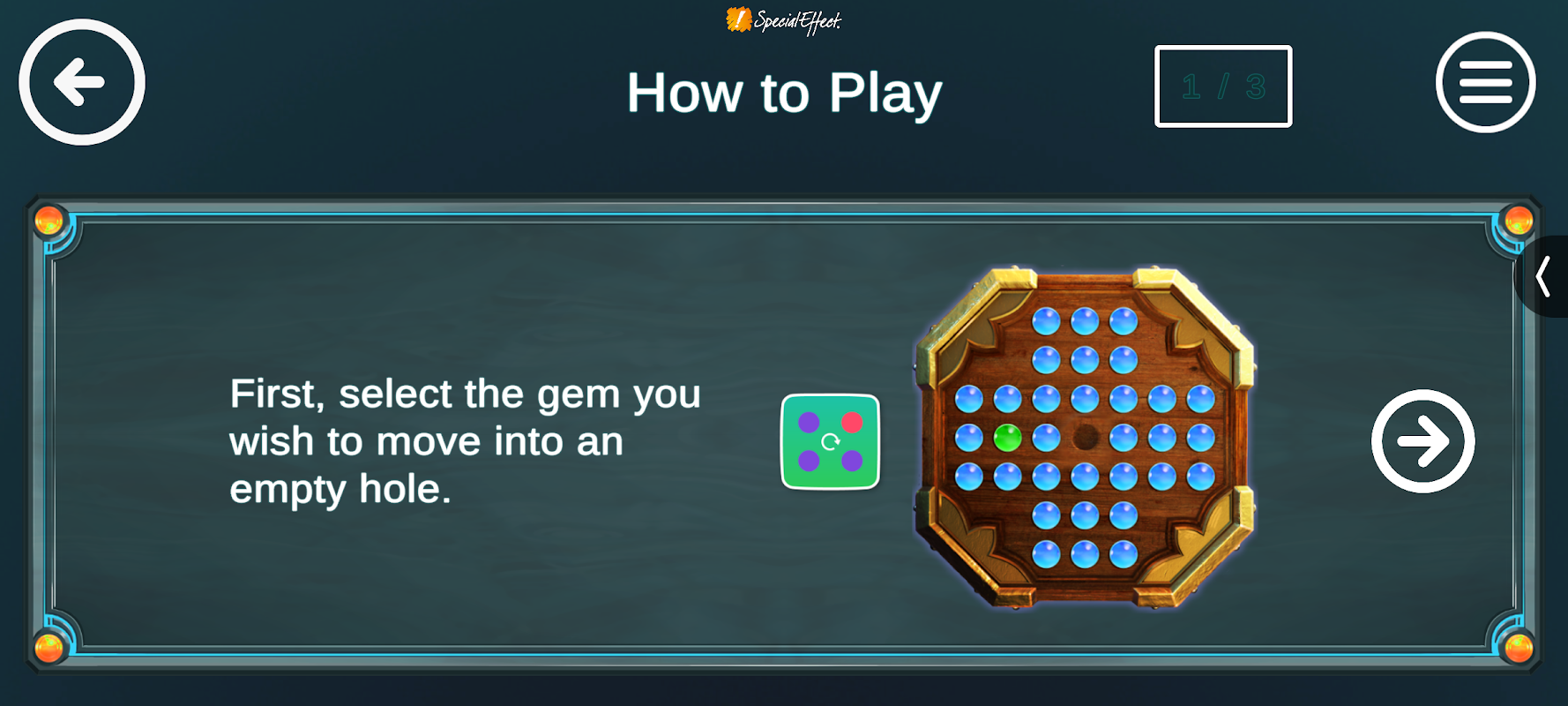 Nelle impostazioni di gioco, puoi scegliere tra la modalità di controllo "Precisa" o "Classica". In modalità "Precisa", selezioni direttamente la gemma che desideri spostare prima di selezionare la buca vuota in cui spostarla. Nella modalità "Classica", si ottengono bersagli più grandi e distanziati tra loro. Prima si seleziona il pulsante in alto a sinistra per scegliere quale gemma muovere, poi, se può saltare in più direzioni, si usa il pulsante in basso a sinistra per scegliere quale. Per effettuare il salto, si usa il pulsante a destra.