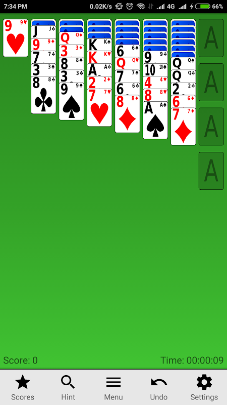 This game has a undo function to take back up to 20 card movements. A hint function shows you up to 3 possible card movements at once.
