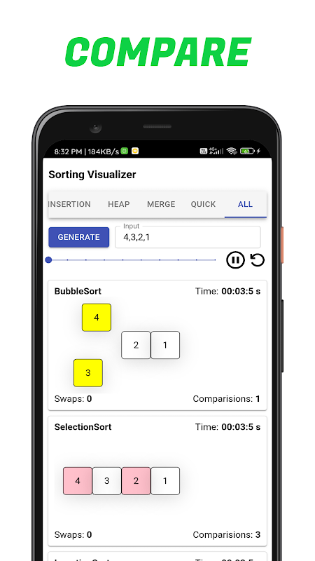 Questa app supporta la visualizzazione di diversi algoritmi di ordinamento.