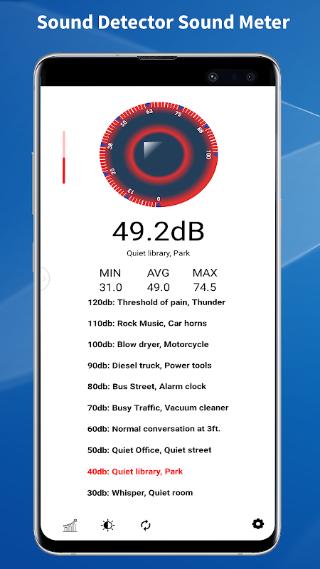 Sound detector and noise meter uses the phone built-in microphone for measuring the volume of sound in decibels(dB) and the graph is used to show the continuous changes in measuring the sound and noise.