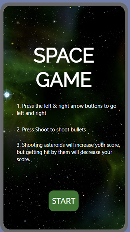 Solo un semplice gioco su come sparare agli asteroidi. Basta fare clic sul pulsante e allinearsi con l'asteroide per distruggerlo e ottenere alcuni punti. (glitch così strani che non riesco a capire in anticipo)