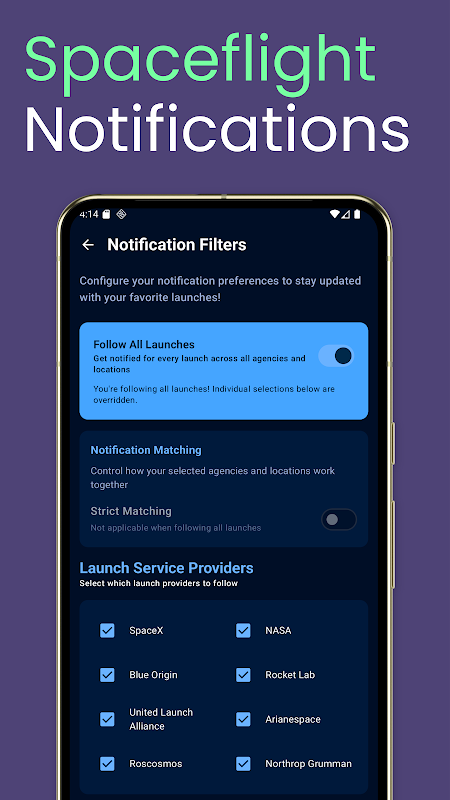 Segui i lanci di SpaceX, NASA, ULA, ISRO, JAXA, Roscosmos, ESA e altri ancora, tutto in un'unica app veloce, affidabile e dal design accattivante.