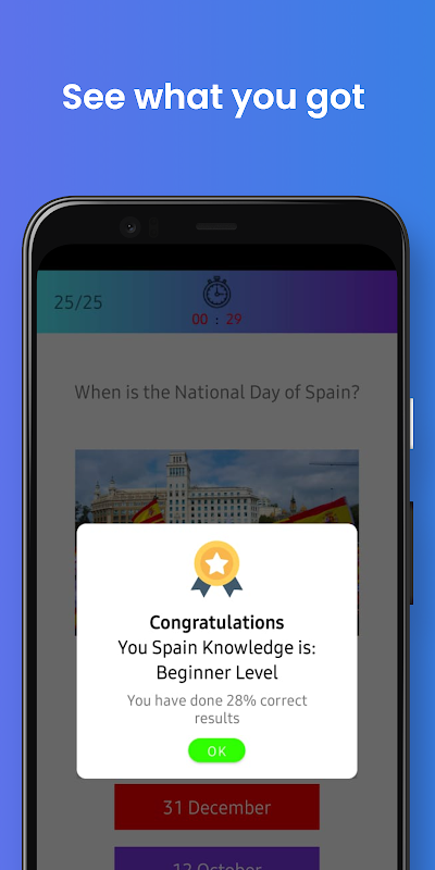 So, download "Spain Quiz" trivia game and show the world that knowing random things about Spain can be fun and useful!