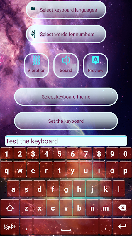 🌟 Choose your favourite galactic background and set it up in just a few swipes of your finger! Text and type all day long on your new emoji keypad and change your keyboard theme as you wish! Install this perfect keyboard changer and decorate your phone with the best awe-inspiring wallpaper backgrounds for your mobile key pad! Put on an insta custom made keyboard skin and start chatting on your new dazzling qwerty keypad for hours on end! Personalize the style of your keypad and let it glitter with cute colors and patterns! Choose a different style of keypad every day and try out all the sparkly effects and designs! Enjoy the nocturnal beauty of your keyboard in silent amazement and share it with friends!