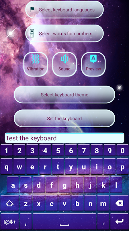 2. Click on 'Set the Keyboard to Default' button and select Sparkly Galaxy Keyboard Themes with Emoticons;