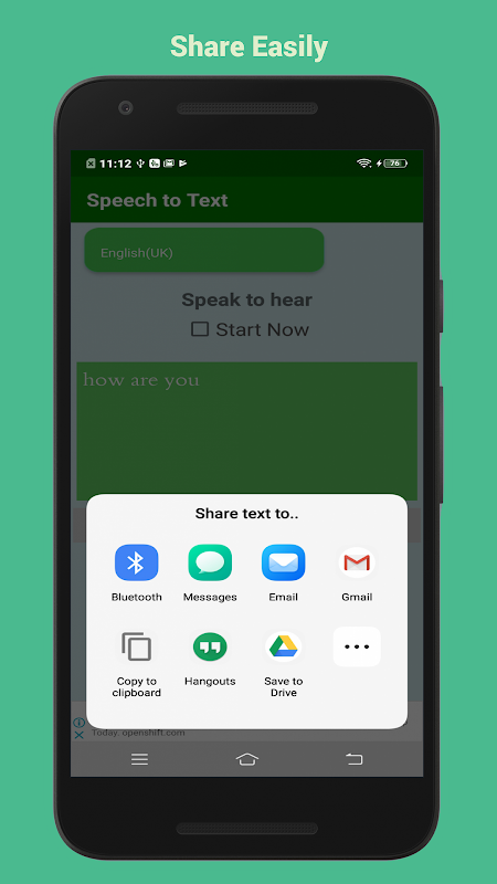 Speech to Text Converter app help you when you are busy & you need to text urgently & cannot type. Using Speech to Text app you can share your text file with all the supported application on your phone. Also you can copy the text and send as a message/text form to your contacts.