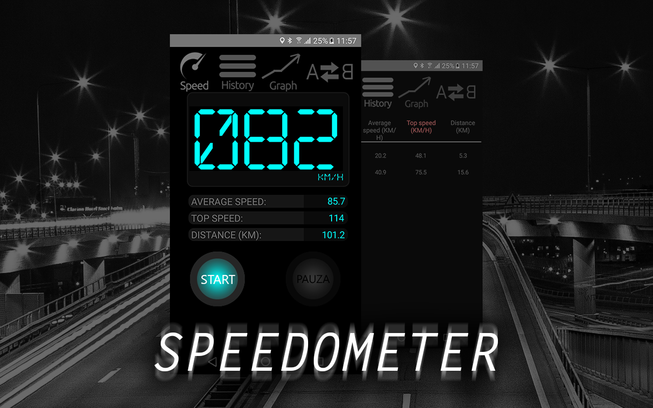 L'applicazione è stata sviluppata incroci storia tachimetro, che vengono memorizzati automaticamente i dati su. La massima e la velocità media, distanza percorsa e percorso. grafico interattivo mostra chiaramente il rapporto tra la velocità in volta. Tutti tachimetro dati sono disposti in ordine cronologico e può essere gestito.