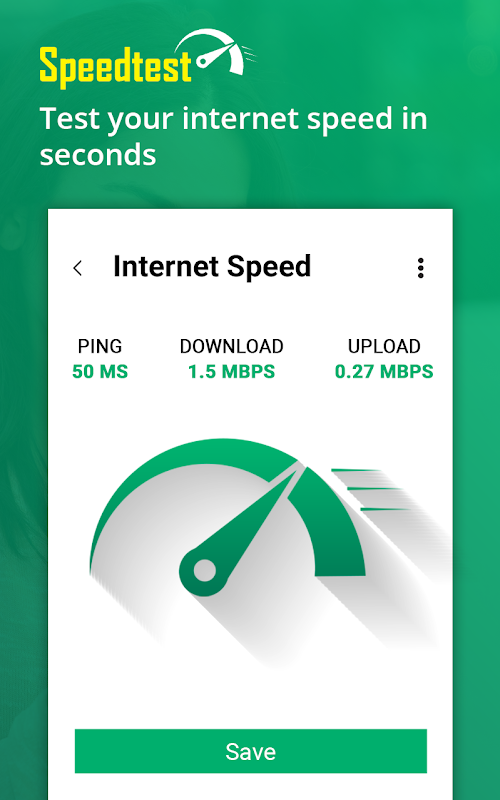 Lets you accurately test your internet speed in seconds. It displays both your download & upload speed at a given time. It can display your internet speed in both MBPS/KBPS. You can also get your phone's IP address.