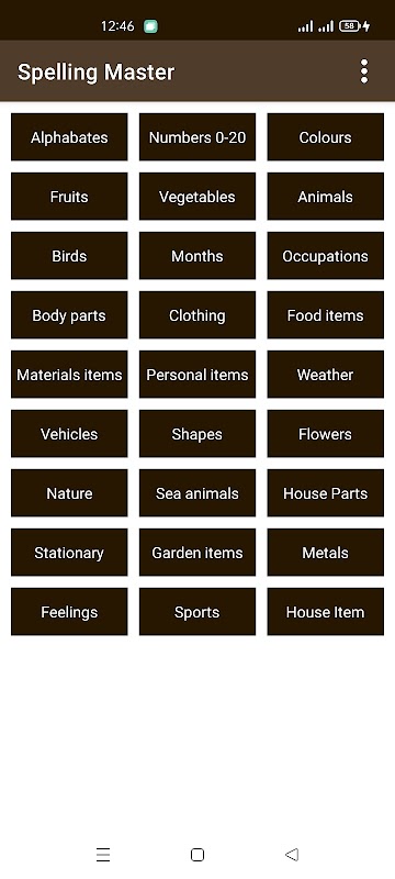 Ci sono 27 categorie in Spelling Master English per consentire agli utenti di correggere i propri errori di ortografia.