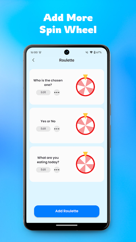 Spin Wheel: Finger Picker rende le decisioni fluide e coinvolgenti. Puoi passare facilmente da una ruota decisionale all'altra, aggiungere opzioni creative e girare ovunque, anche offline. Che tu sia a casa, al lavoro o a un evento, Spin The Wheel: Random Picker è pronto a rendere la scelta semplice.