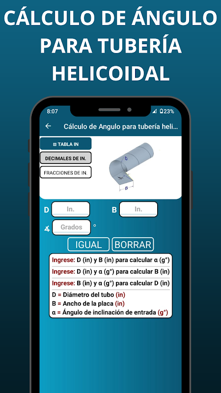 App tubo elicoidale: calcolo dell'angolo e del peso in decimali e frazioni