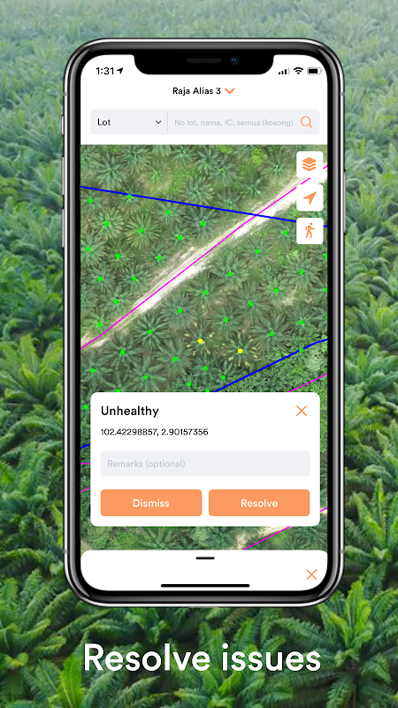 Strumento GIS interattivo per i gestori delle piantagioni di FELDA per gestire in modo efficiente le loro piantagioni. Visualizza i punti degli alberi, i punti vacanti e malsani su una mappa ortomosaica ad alta risoluzione delle piantagioni, cerca e filtra i lotti, risolvi i problemi direttamente e scarica i dati offline per l'utilizzo offline.
