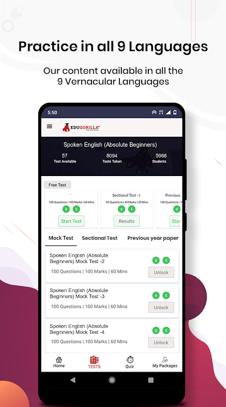La nostra app di preparazione all'esame di inglese parlato (principianti assoluti) aiuta gli studenti a costruire un vocabolario forte insieme alle capacità di conversazione in inglese. Migliora anche gli studenti a parlare inglese senza errori grammaticali di base. L'app per test di simulazione online di EduGorilla's Spoken English (Absolute Beginners) garantisce un vocabolario di base e un po 'avanzato, abilità di comunicazione di base e formazione di frasi senza errori. Pertanto, i nostri falsi test in linea di inglese parlato (principianti assoluti) si dimostrano utili con i test di simulazione online più apprezzati.