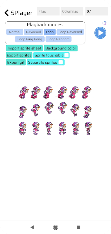 Per testare un sprite sheet, importa il foglio sprite che desideri testare e specifica il numero di righe e colonne del foglio sprite, quindi premi il pulsante di riproduzione.
