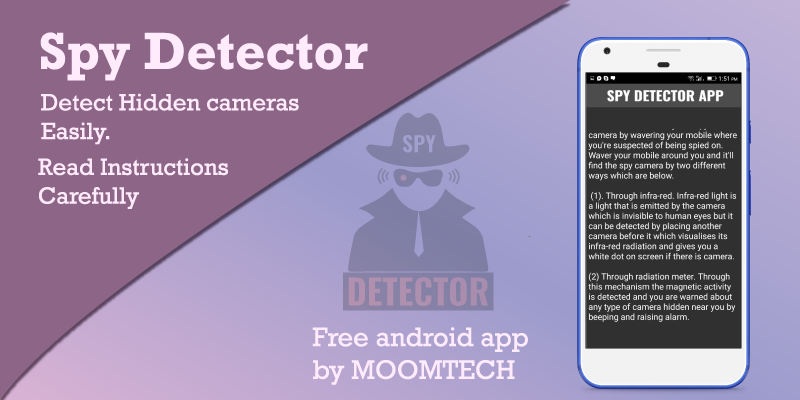 In this method, the app use magnetic sensors to detect spy cams and devices its detect the radiation which emits from the devices when it detect the radiation of such devices it will start beef sound and also increase the value of radiation meter.