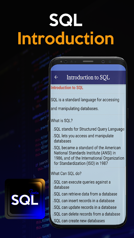 SQL Learn è un'app indispensabile per tutti gli studenti di programmazione o di informatica per imparare la programmazione SQL ogni volta che lo desiderano. Sia che ti stia preparando per un colloquio SQL o per qualsiasi esame che richieda la conoscenza della programmazione SQL, puoi trovare contenuti straordinari in questa app di apprendimento della programmazione.