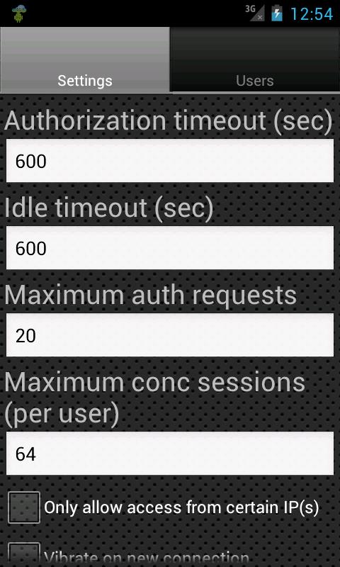 - For every SSH Server you can set name, port, multiple users, only access from certain IP addresses, vibrate on a new connection, enable logging, only log errors, start the server when connected to a specific WIFI network and disconnect when the WIFI network is lost, start on boot, max auth attempts, authorization timeout, idle timeout, max concurrent sessions (per user)