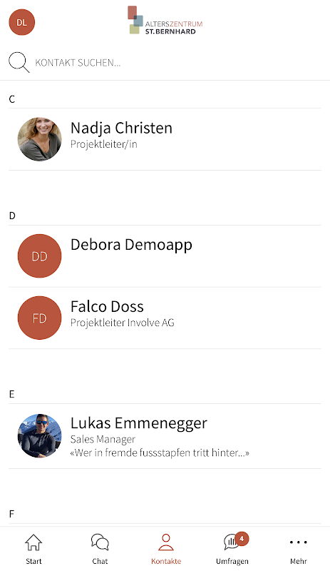 Scopri le ultime informazioni sulla tua azienda in qualsiasi momento, indipendentemente dalla posizione, trova i tuoi colleghi di lavoro facilmente e semplicemente nella directory dei contatti e chatta 1:1 o nelle chat di gruppo. Il tutto con un software svizzero affidabile su server svizzeri sicuri.