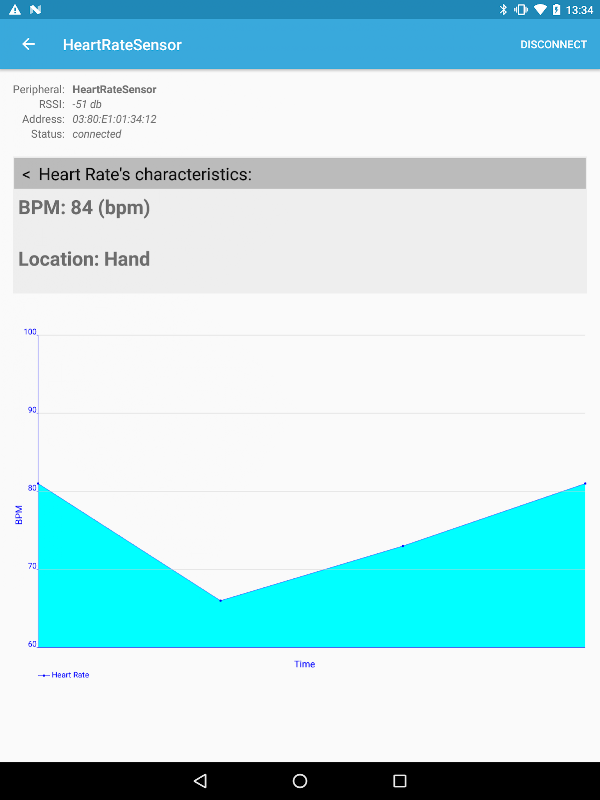 È sufficiente avviare il profilo ST BLE, eseguire la scansione della rete e stabilire una connessione Bluetooth LE con il dispositivo dall'elenco dei dispositivi rilevati. Quindi selezionare il profilo e visualizzare i dati ricevuti.