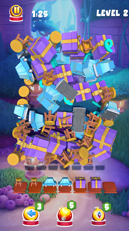 Ecco il ciclo fondamentale: toccate un oggetto per raccoglierlo, quindi abbinate 3 oggetti identici per rimuoverli. Sembra facile, finché il vostro vassoio non ha solo 7 slot. Ogni scelta occupa spazio e la torre continua a tentarvi con nuovi oggetti... mentre quelli di cui avete bisogno sono sepolti sotto gli altri. Se prendete troppi pezzi diversi, il vostro vassoio si intasa. Niente spazio, niente abbinamento, fine della partita. Per vincere, dovrai leggere i livelli, sbloccare gli oggetti bloccati e pianificare le combo come un professionista: