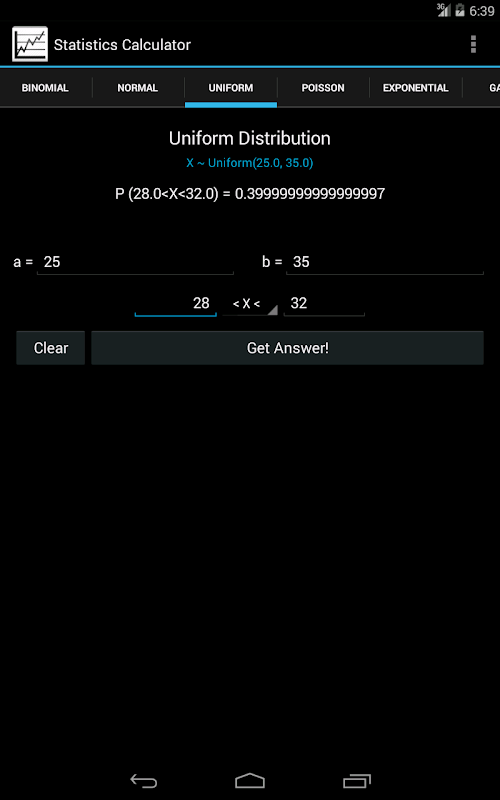 Prendere un corso di statistica al liceo o all'università? Allora questa è l'applicazione avrai sicuramente verrà voglia di controllare le vostre risposte. Con la sua interfaccia ricca e facile da usare utente Statistiche Calculator ti aiuterà a trovare le probabilità di variabili casuali che seguono alcune distribuzioni di probabilità.