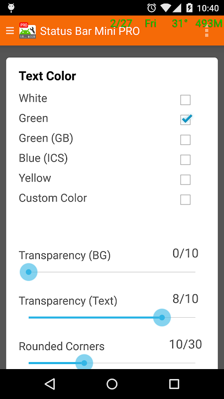 Questa applicazione aggiunge letture testuali significativi (testo sovrapposizione) allo schermo. È possibile aggiungere la data in diversi formati, il livello della batteria e della temperatura, memoria disponibile (RAM) e la lettura CPU. È possibile consultare rapidamente le statistiche in qualsiasi momento. È anche possibile modificare la loro dimensione, il colore, l'ordine, la posizione, la trasparenza, e il layout.