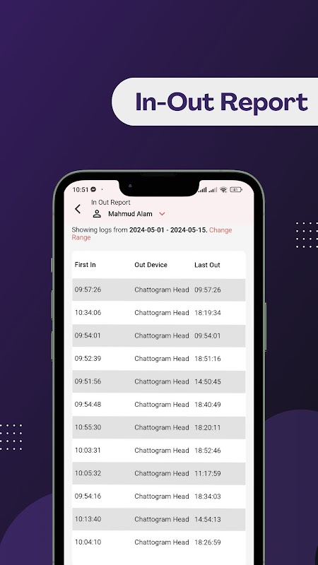 Registro di accesso: accedi a un registro completo di tutti i registri delle presenze con un intervallo di date personalizzato.