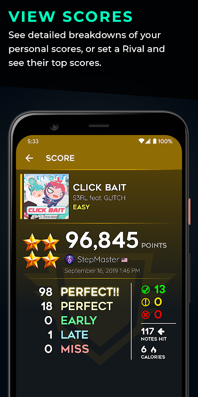 Utilizza le funzionalità di monitoraggio del punteggio integrate per tenere traccia dei brani riprodotti e visualizzare i punteggi migliori o visualizzare statistiche dettagliate per qualsiasi punteggio inviato nel gioco, inclusi i passi totali e le calorie. Condividi i tuoi punteggi esternamente ad altre app e servizi di messaggistica per mostrare i tuoi risultati.
