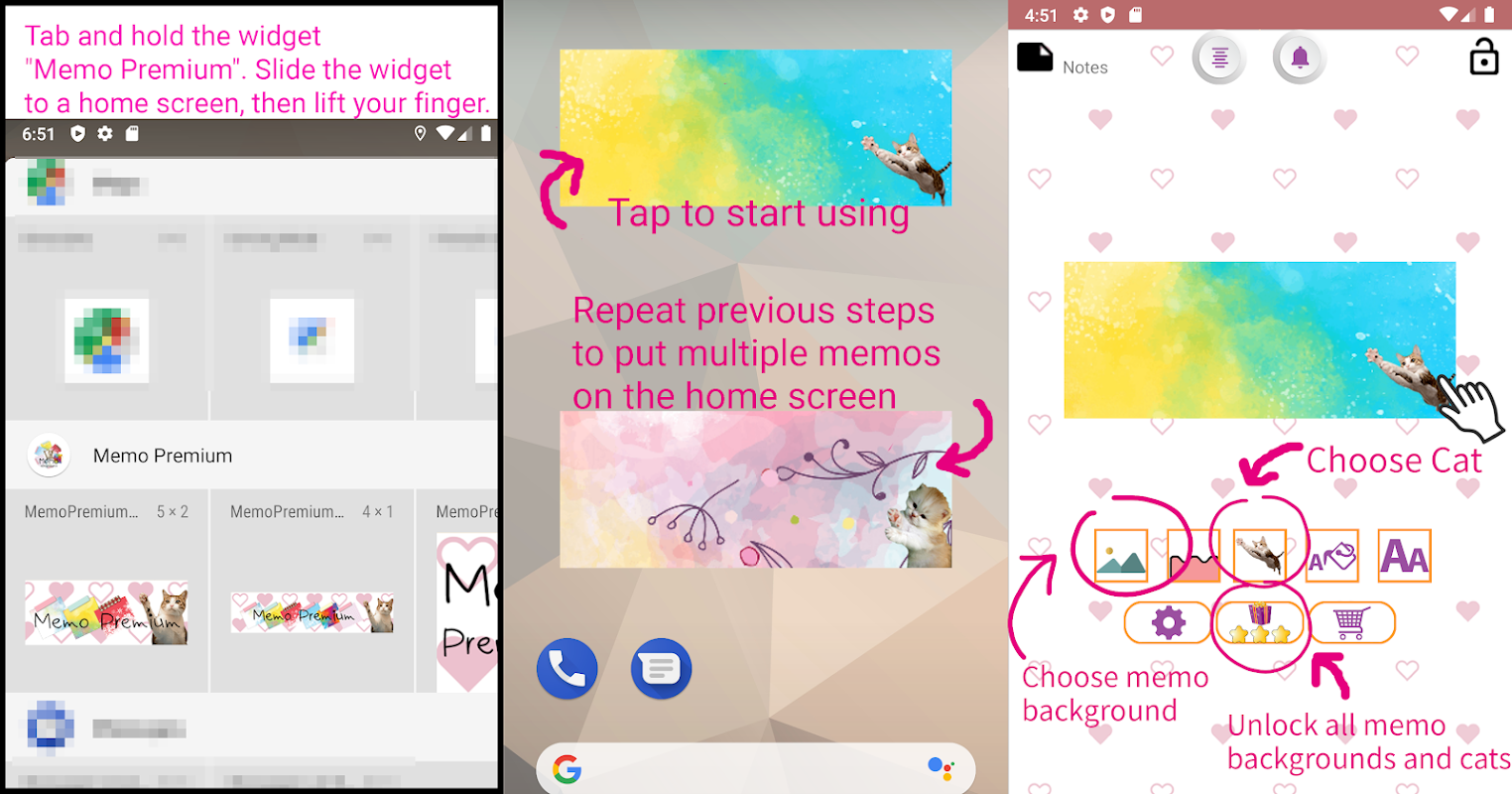 3. Toccare e tenere premuto il widget "Memo Premium". Fai scorrere il widget su una schermata iniziale, quindi solleva il dito.