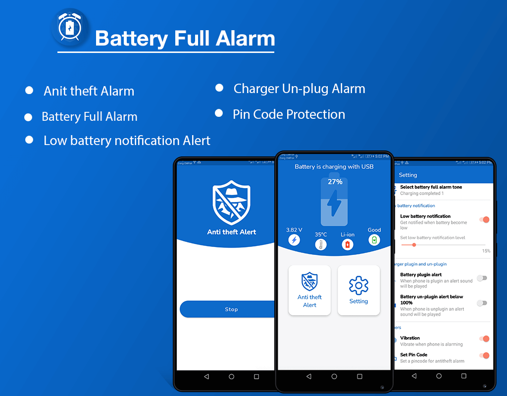 L'app di ricarica Stop Over è molto utile per evitare che la batteria si sovraccarichi quando la batteria raggiunge il 100% di carica. L'app di allarme batteria carica ti avviserà quando la batteria è completamente carica. Un'altra caratteristica è che quando qualcuno scollega il telefono dal caricabatterie ti darà anche un avviso, l'utente può attivare / disattivare questa funzione dalle impostazioni.