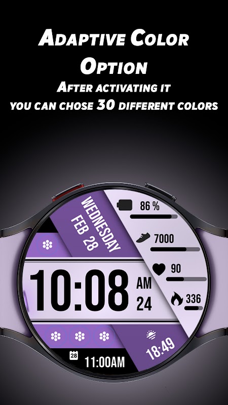 * Opzione per attivare i colori adattivi (dopo averla attivata puoi scegliere 30 colori diversi dalla scheda colori del menu di personalizzazione del tuo orologio)