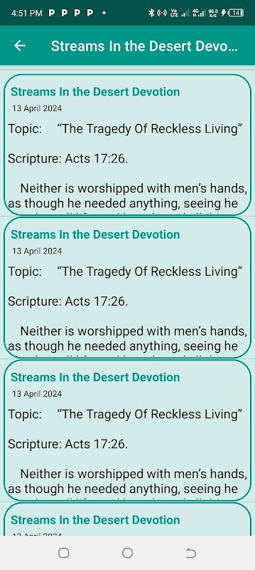 App Streams In The Desert Devotion con interfaccia facile e semplice e sintesi vocale con anche un'opzione per selezionare e leggere la devozione quotidiana in più di 20 lingue. L'app dispone di una funzione di devozione preferita che ti aiuta ad aggiungere la devozione che ti piace ai preferiti facendo clic sul pulsante del cuore. L'App ti aiuterà a maturare spiritualmente poiché la parola di Dio ti arriva ogni giorno. L'app ti aiuta a leggere e ascoltare devozionali quotidiani all'interno dell'app mentre sei in movimento.