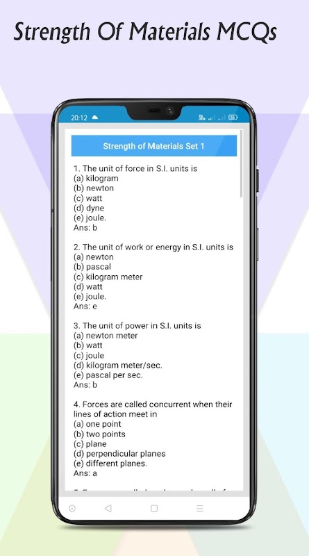This application contains 15 sets of multiple choice questions of strength of Materials with answers section wise.