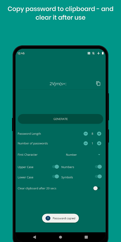 Con Strong Password Generator puoi generare una password di qualsiasi lunghezza con la complessità che desideri con il semplice tocco di un pulsante. Imposta semplicemente la lunghezza della password che desideri, se includerà lettere maiuscole, minuscole, numeri e/o simboli e l'app farà il resto.