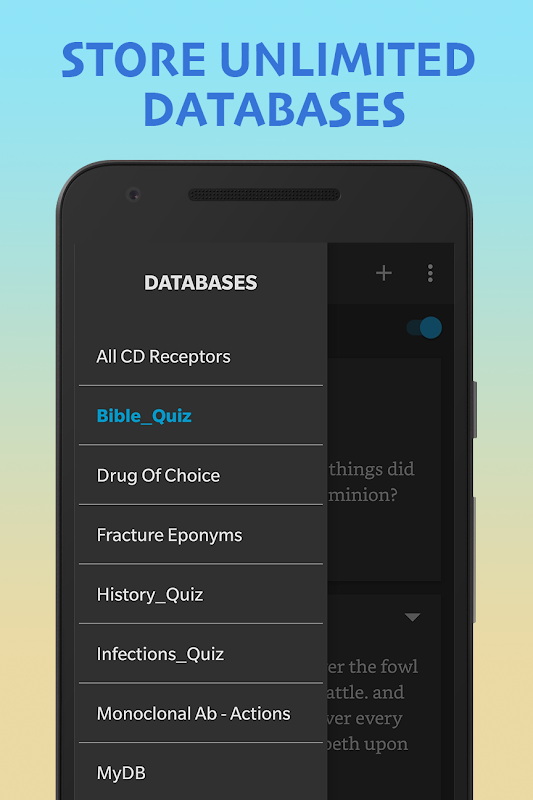 Study Helper ti consente di archiviare porzioni di informazioni in modo da potervi accedere sempre e ovunque. Studia ogni genere di cose dove e quando vuoi. Una cosa che distingue l'assistente allo studio dalle altre app sul mercato è la capacità di condividere database.