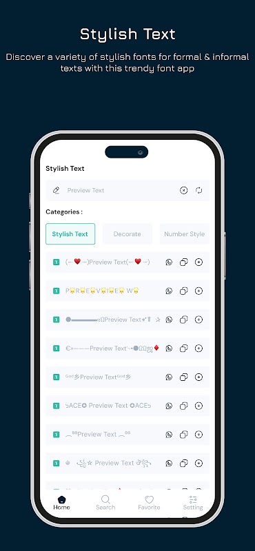 Migliora il tuo gioco di testo con l'app Stylish Text & Fonts, uno strumento di trasformazione che trascende la comunicazione ordinaria. Dì addio ai testi banali e abbraccia un mondo di creatività, dove le tue parole diventano una tela per stili espressivi. Scatena la potenza dei caratteri Unicode per creare testi accattivanti in una miriade di caratteri incantevoli, tutti a portata di mano.