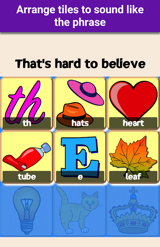 In a traditional rebus game, you determine a phrase from pictures. With Subers, you start with a phrase and must unscramble the pictures to sound like it. But watch out for decoys! Not all of the picture tiles may be needed.