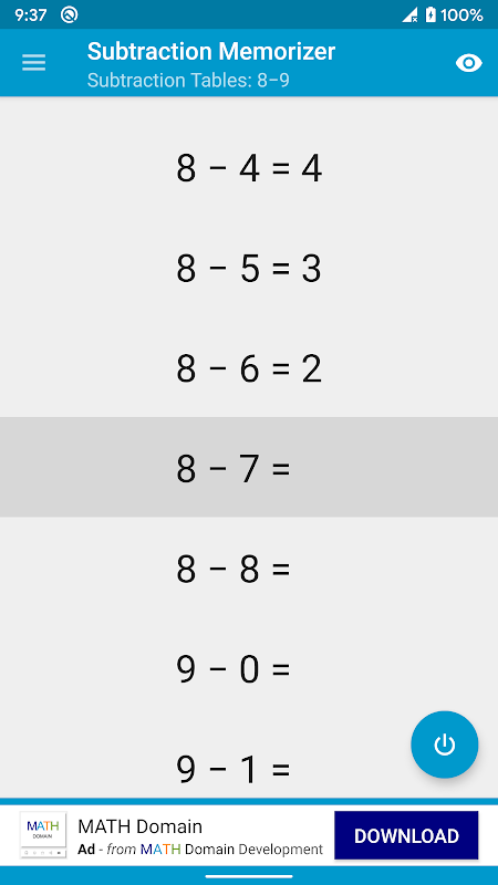 Tabelle di sottrazione fornisce un ambiente di apprendimento senza stress. È una versione moderna delle carte flash di sottrazione. Quest'area mostra l'intera tabella di sottrazione a una cifra, una riga alla volta. Puoi mostrare o nascondere le risposte a qualsiasi problema di sottrazione in qualsiasi momento. Non ci sono domande, nessun limite di tempo, nessun tracciamento dei dati.