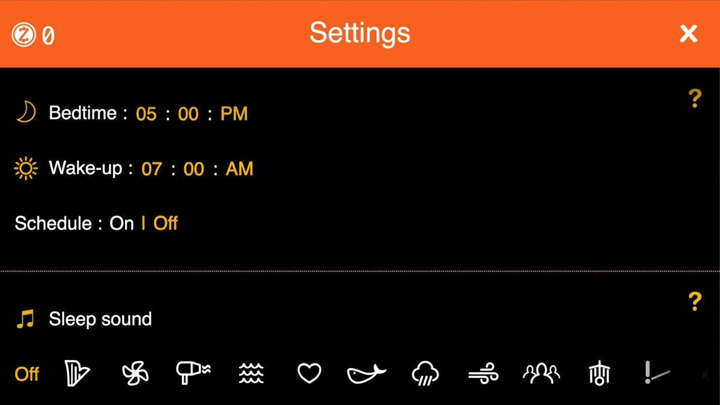 Gli orari di sveglia possono essere impostati dalla pagina delle impostazioni o toccando i pulsanti con le cifre arancioni sulla schermata principale diurna. Premendo "Buonanotte" si attiva un tramonto immediato (ora di andare a dormire), ma è anche possibile impostare l'ora di andare a dormire automatica. Inoltre, è disponibile un programmatore opzionale di 7 giorni, accessibile nelle impostazioni, per adattarsi a schemi di sonno variabili e riposini nel fine settimana.