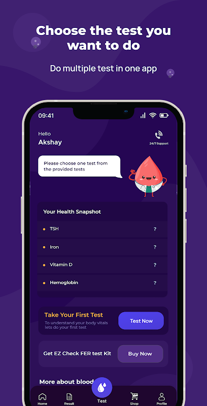 Test multipli, un'unica app: scegli tra una varietà di test essenziali, inclusi i livelli di ferro, ferritina, tiroide, allergie ed emoglobina.