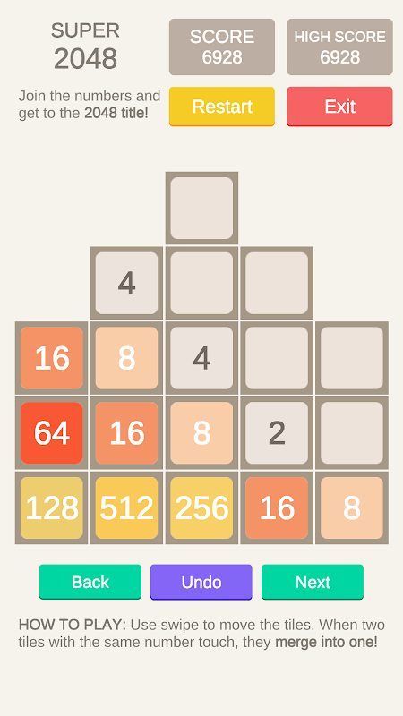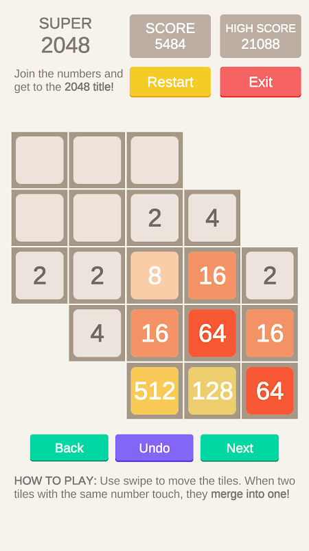 Super 2048 is a new 2048 puzzle game. Join the numbers and get to the 2048 title!