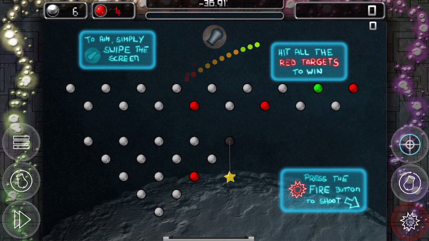 The goal of the game is to hit all the red target pegs with your cannon before you run out of balls. A catcher will help you save some of your balls. It floats around at the bottom of the screen and can also be used to catch stars and other stuff. By winning levels you will earn stars. Collect enough of them to unlock new Levels.